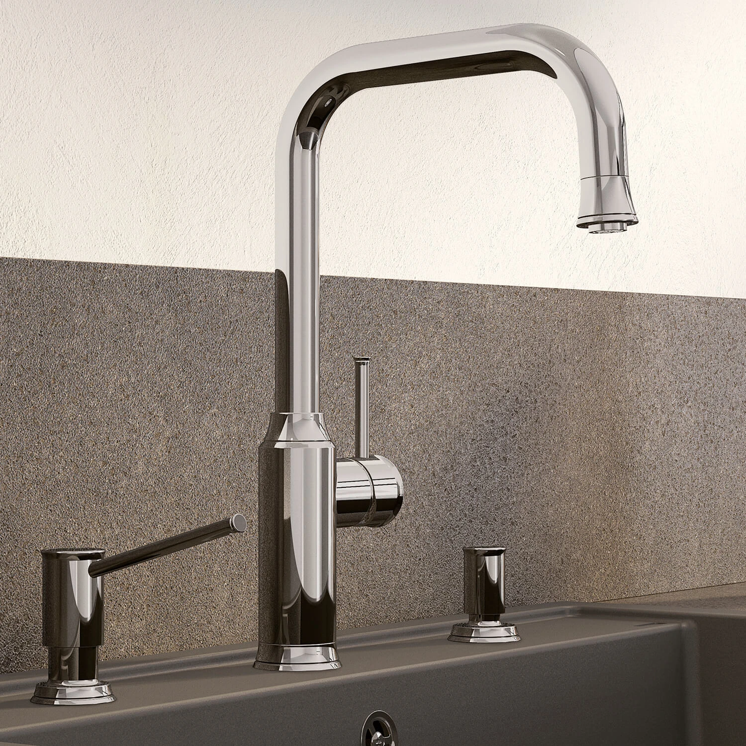 - High arced spout with extendable textile covered pull out hose