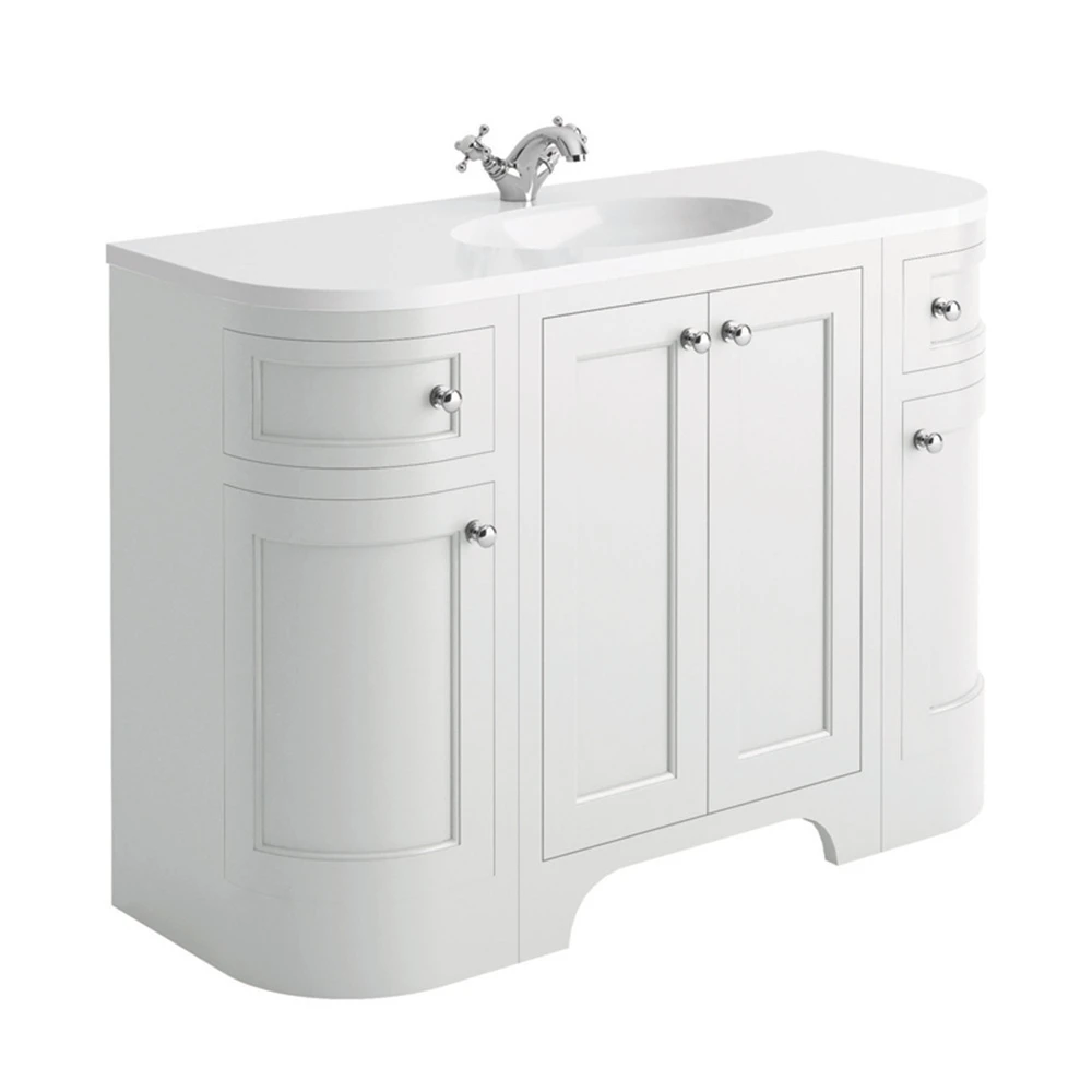 - Supplied with Minerva solid surface integrated worktop and chrome knob handles