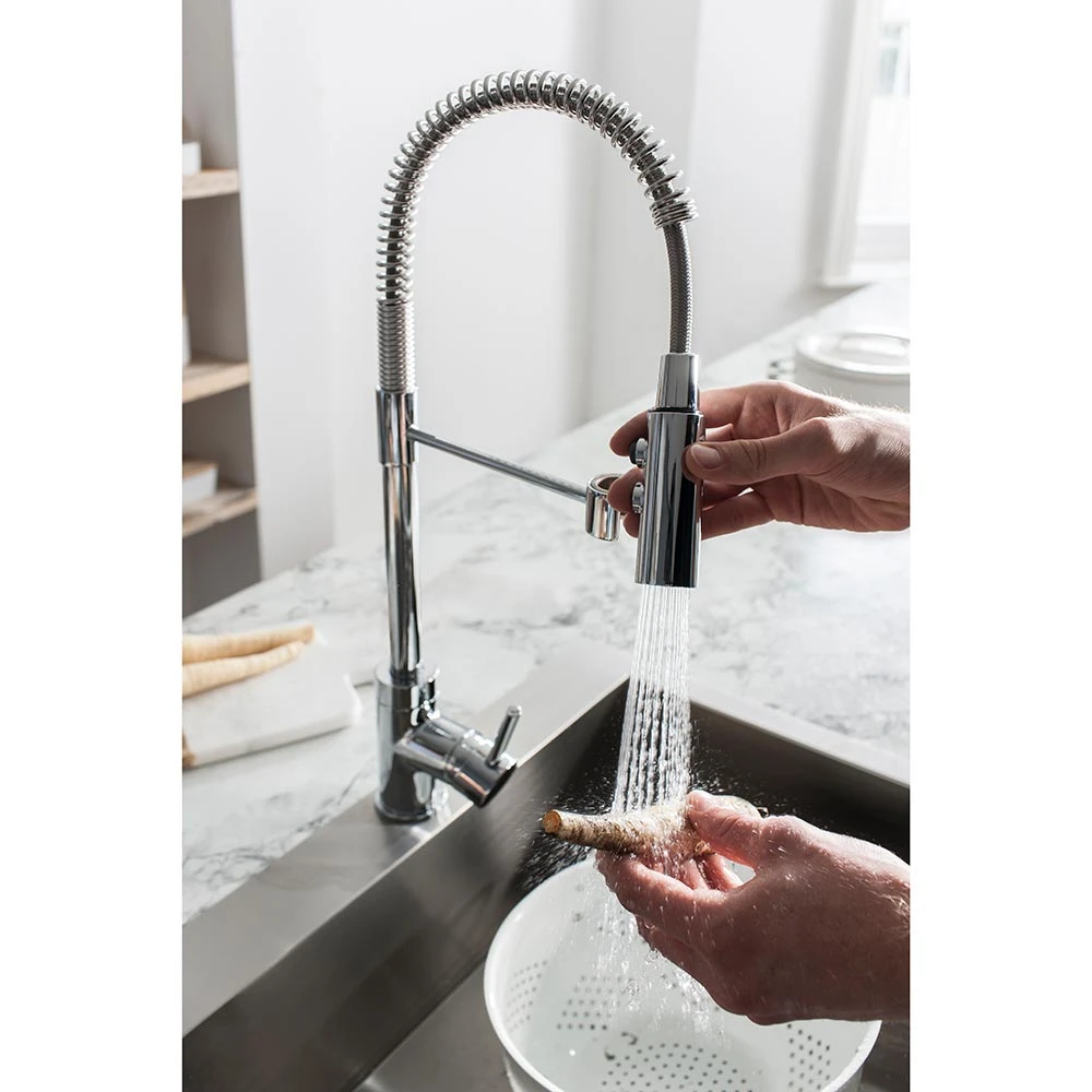 The Crosswater Cucina Cook side lever mono kitchen mixer with flexi spray is an exquisite example of just such a pull out kitchen tap. It’s flexi spray attachment can be pulled out from the housing which keeps it in place on the tap, and then this can be used to do a multitude of different jobs, from rinsing off your fruit and veg, to cleaning those hard to reach areas of your kitchen sink. Two buttons on the side of the attachment allow you to switch between spray options, and once you’re finished, the pull out spray simply clips back into the housing that keeps it in place and you have a ‘normal’ kitchen tap, ready to do any job that is required.