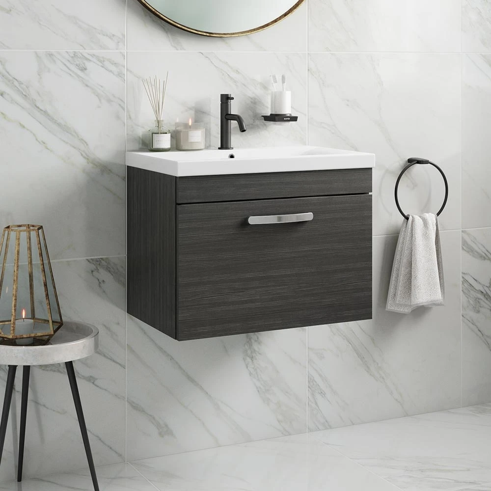 Boasting a stunning angular design and durable FSC certified wood, the Emily wall mounted single drawer vanity unit and basin brings luxury and class to all bathrooms. With soft close drawers offering extra storage space and reducing wear & tear and unwanted noise, you’ll be thrilled with this stylish addition to your home. Wall mounted to create the illusion of a more spacious bathroom and with a captivating hacienda black finish, this Emily unit will never disappoint.
