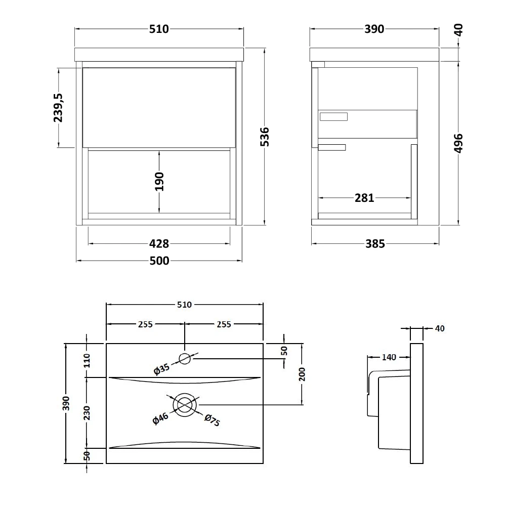 The Hudson Reed Coast 500mm wall mounted vanity unit and basin features a high quality push to open soft close drawer and a modern, hard-wearing and easy to clean ceramic basin.