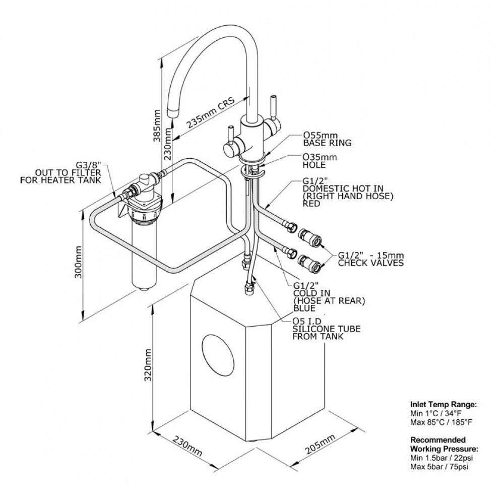The Perrin & Rowe Phoenix can be set to deliver instant hot water in a temperature range from 75°C to 98°C which can be pre-set on the state-of-the-art digital touch screen display on the boiler unit. All it takes is the turn of a handle; no more waiting around for the kettle to boil, just instant hot water, as and when you want it. The Phoenix comes with the latest nano filtration technology which removes debris, water born bacteria, chlorine and other chemicals that can sometimes be found in your water system, and leaves you with perfectly pure water. The filter also helps in the reduction of limescale through your tap and therefore increasing its life.