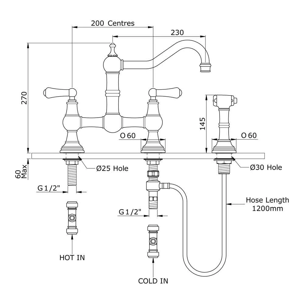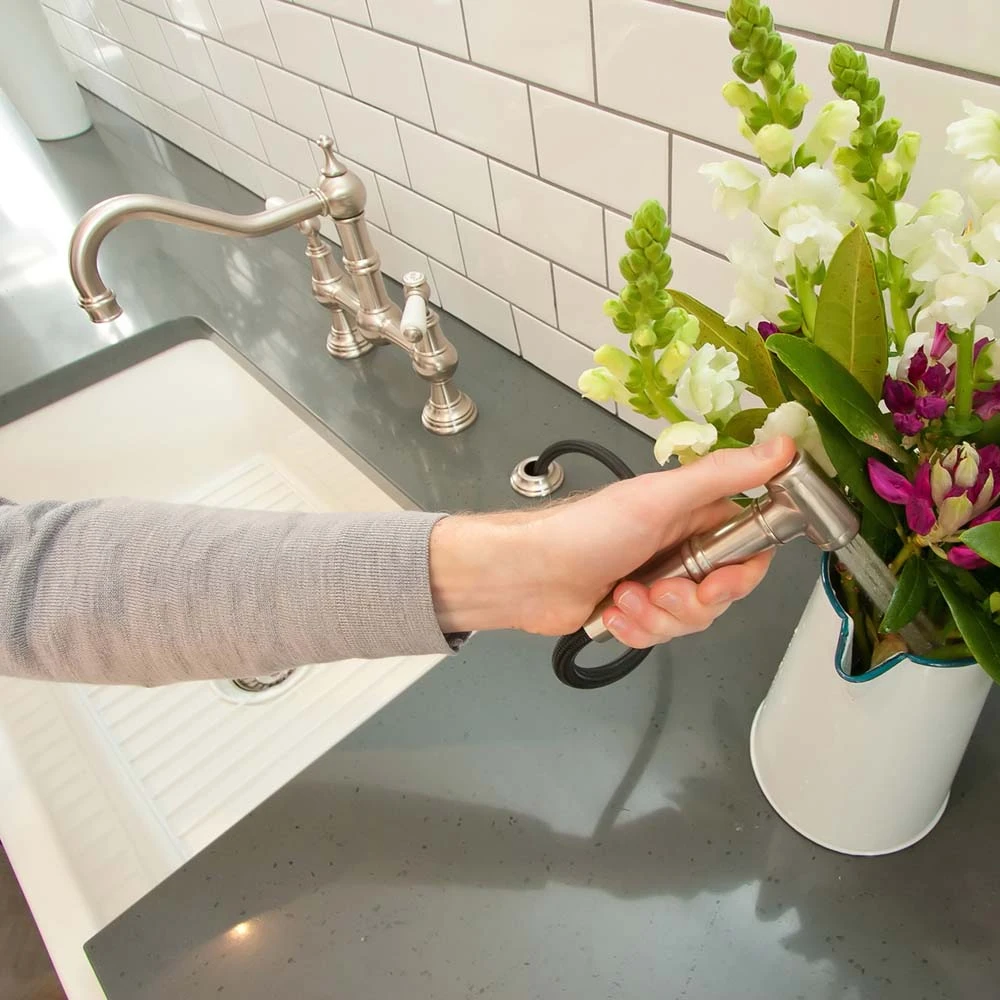 This product features a Perrin & Rowe Hand Rinse. Easy to use and versatile, the rinses can be positioned to the left or the right of the sink. They have insulated handles and a flexible hose (standard length 120cm) ensuring safety and convenience. Hot, cold or mixed water is diverted to the rinse once the top button is pressed.