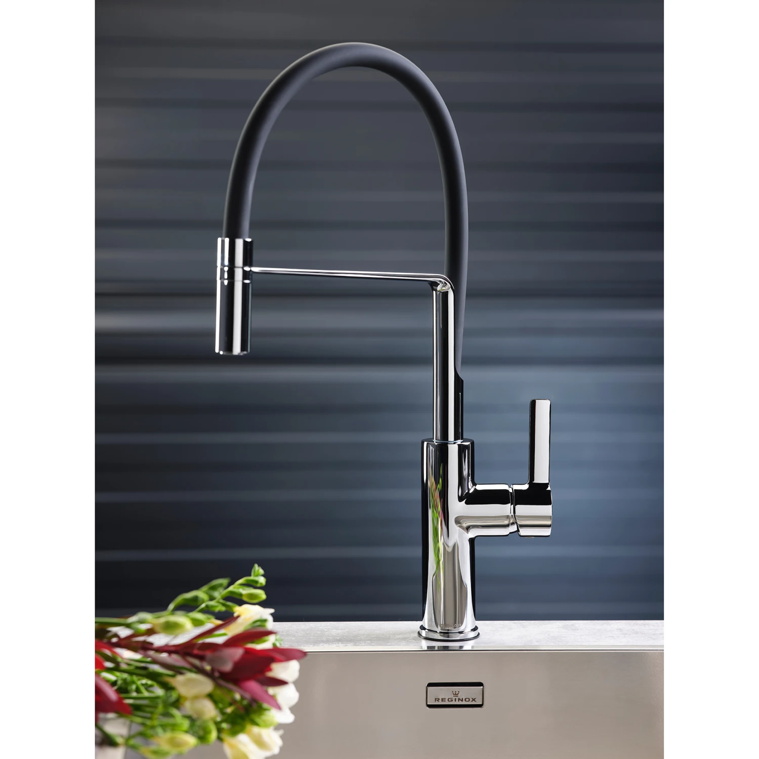 - Modern pull out kitchen tap with a black hose which can be removed from its cradle to rinse fruit & veg or clean the sink and then returned to use again as a normal tap