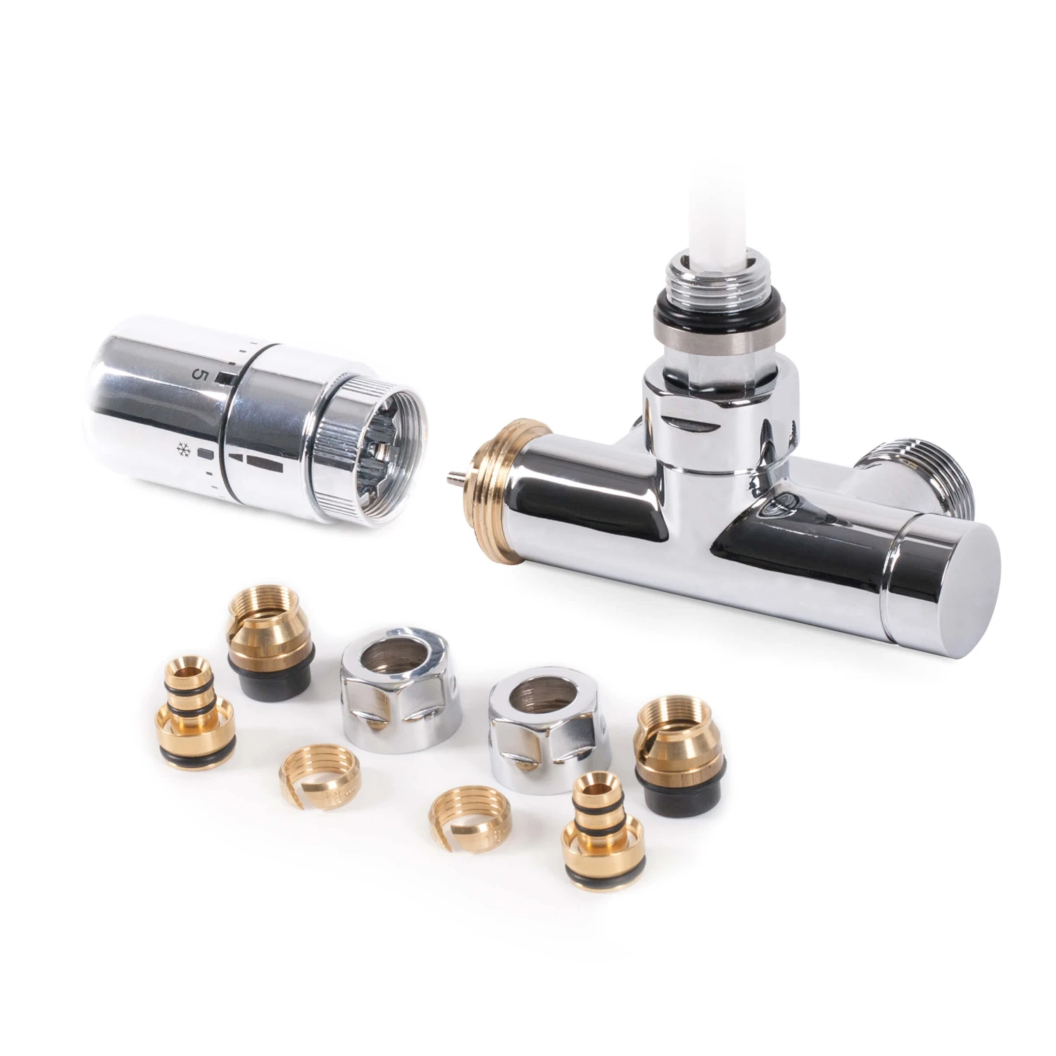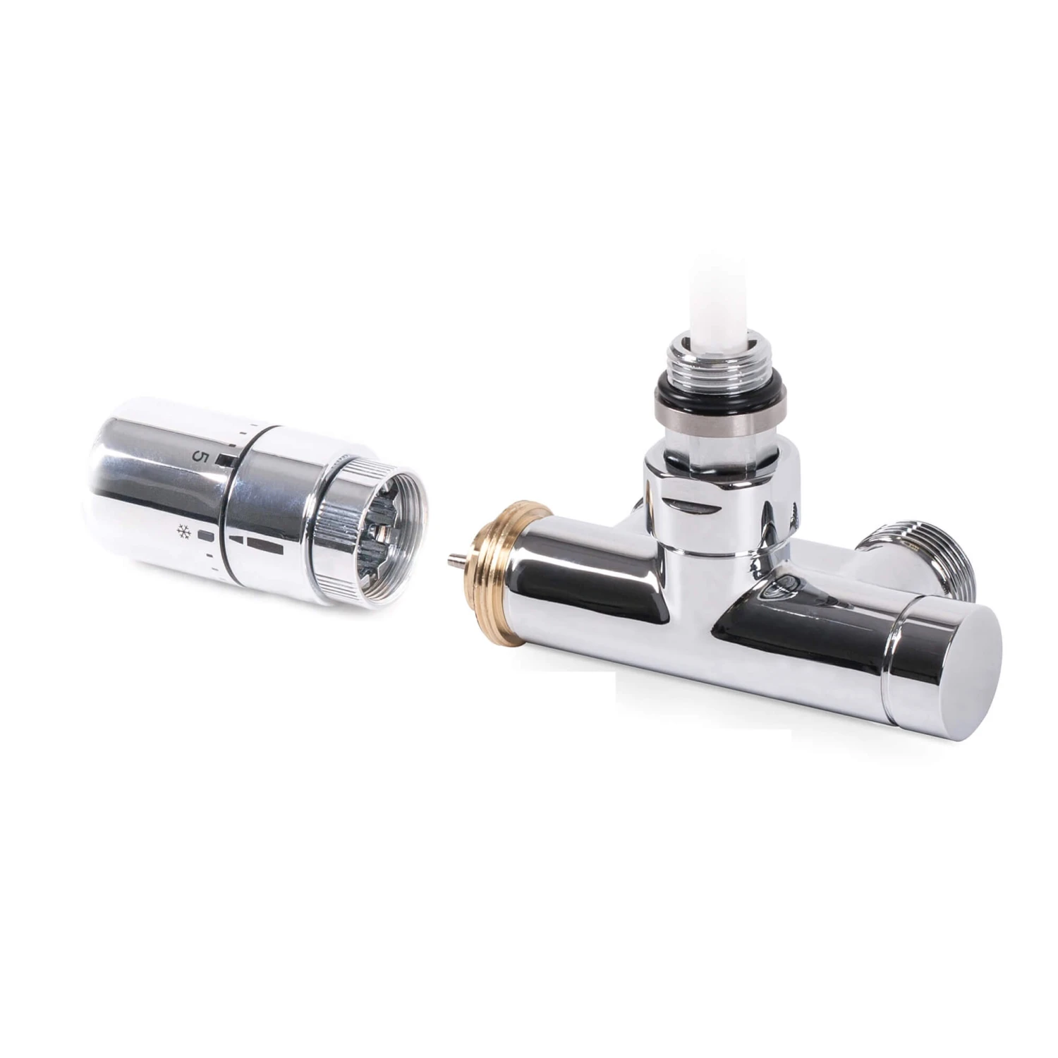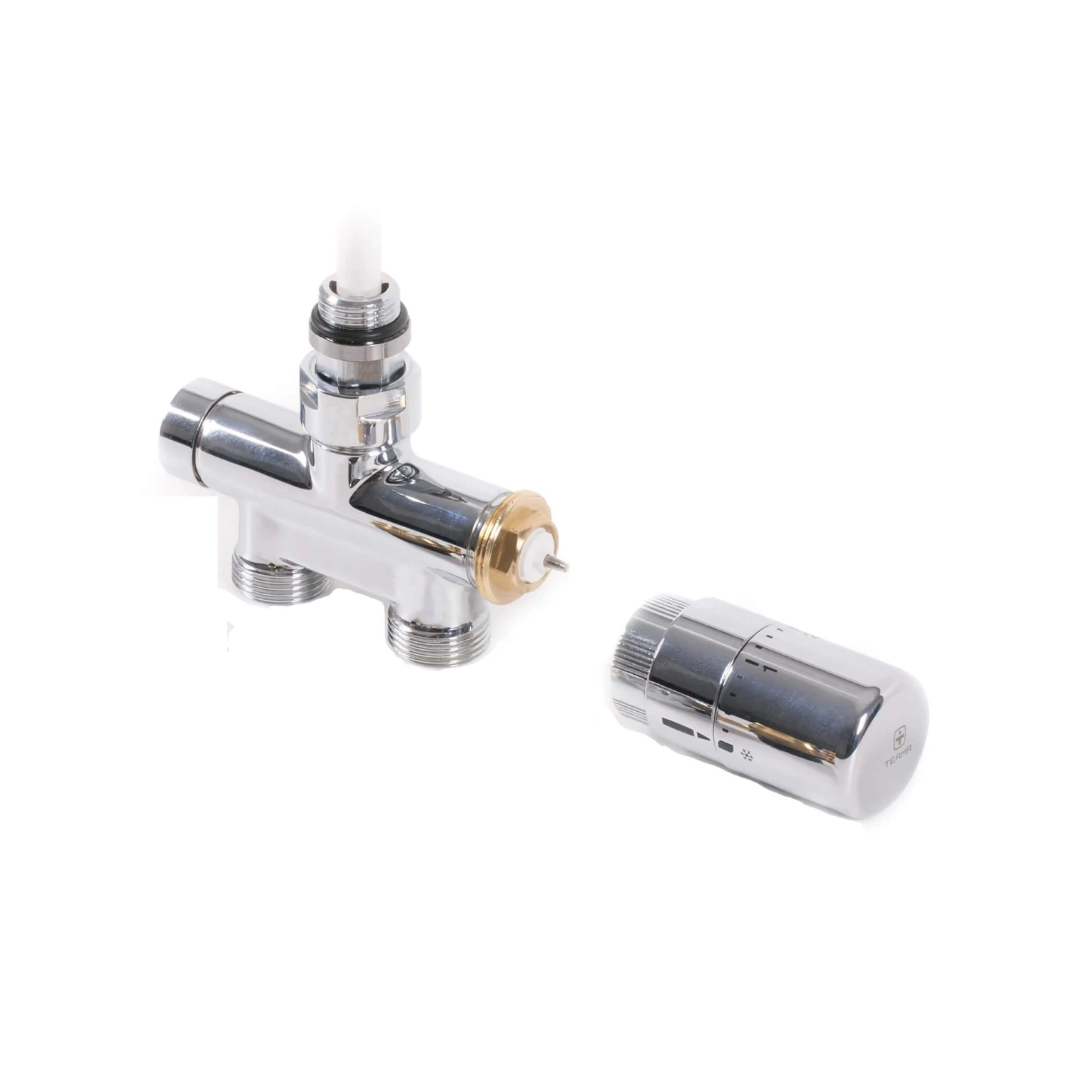 The Terma IntegratedThermostatic Valve with Immersion Tube Set is to be used on Terma heated towel rails that are also going to be used with a Terma Heating Element (sold separately) in the summer months. The Integrated Valve and Immersion Tube means that you don’t have to buy separate radiator valves and a T-piece as would normally be the case. Both the flow and return are able to go in and out of this valve as the flow goes up the tube and the return comes back down the outside of the tube.