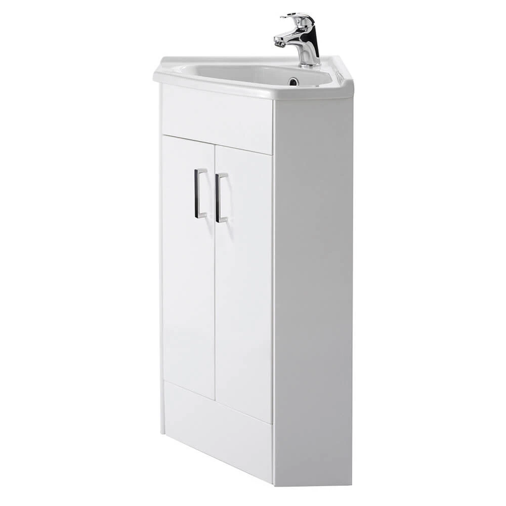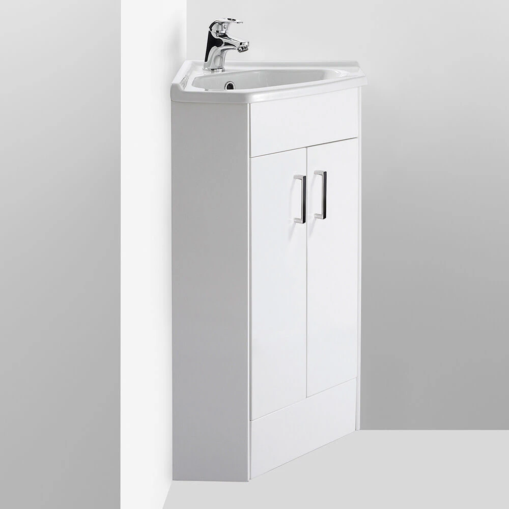 This Corner vanity unit from Tap Warehouse is made from the highest quality materials, finished in a stunning high gloss white and fitted with eye catching chrome handles. Ideal for smaller bathrooms where space maximisation is key, this unit can fit into nearly any corner of your bathroom helping you make the most of your space.