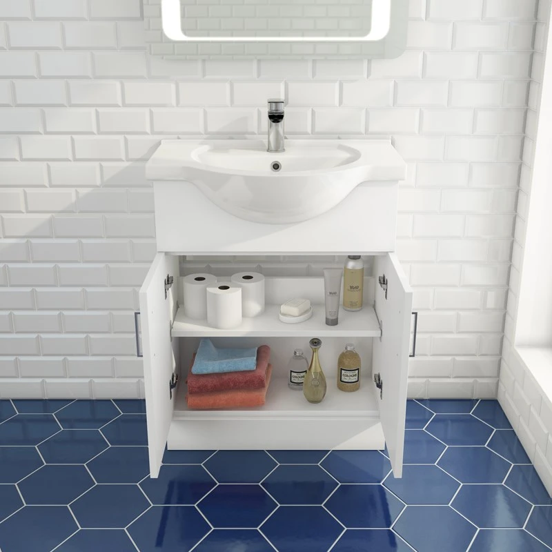 The Vellamo Alpine unit is 650mm wide and has a white ceramic basin above a storage cabinet fitted with chrome handles and soft close doors, perfect for keeping your toiletries tidy and organised. The design of the unit allows it to fit perfectly into any contemporary style bathroom making it an ideal choice for anyone seeking quality and style at a competitive price.