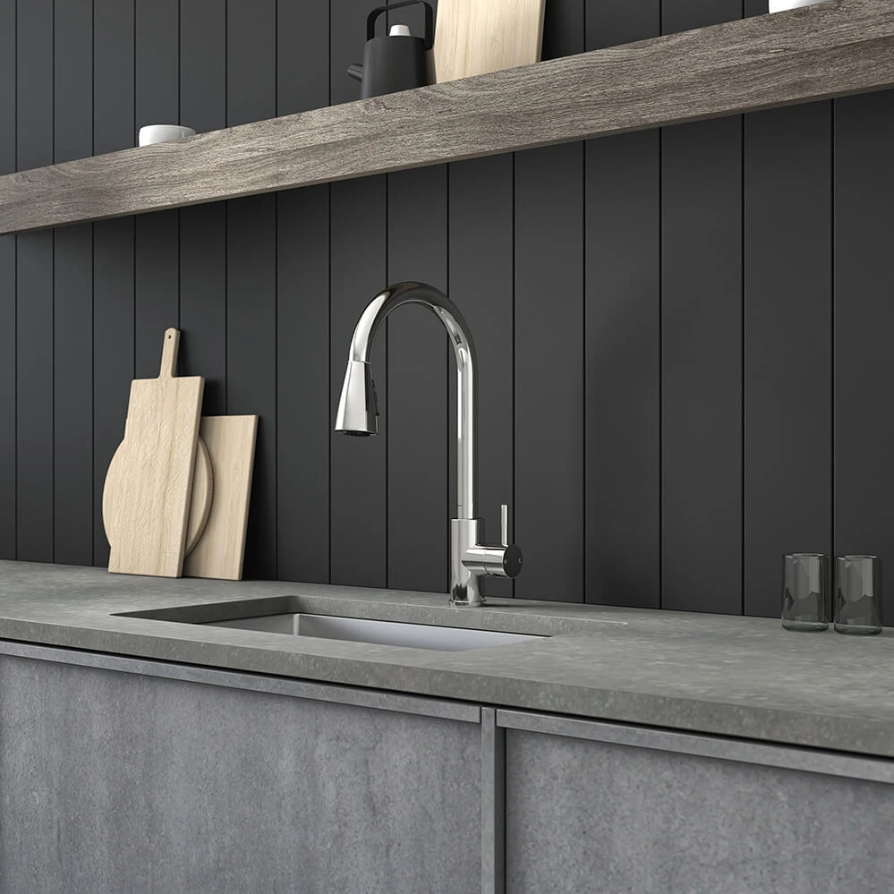 The Inspire from Vellamo has a weighted pullout hose/handset, allowing you to move the tap nozzle around to make washing up, rinsing down, and filling up pots, pans and buckets a breeze. The nozzle has a counterweight on the other end of the hose which is positioned underneath the sink, and this helps retract the nozzle back in to position. Once you’ve used a pullout kitchen tap, you won’t ever want to do without one.