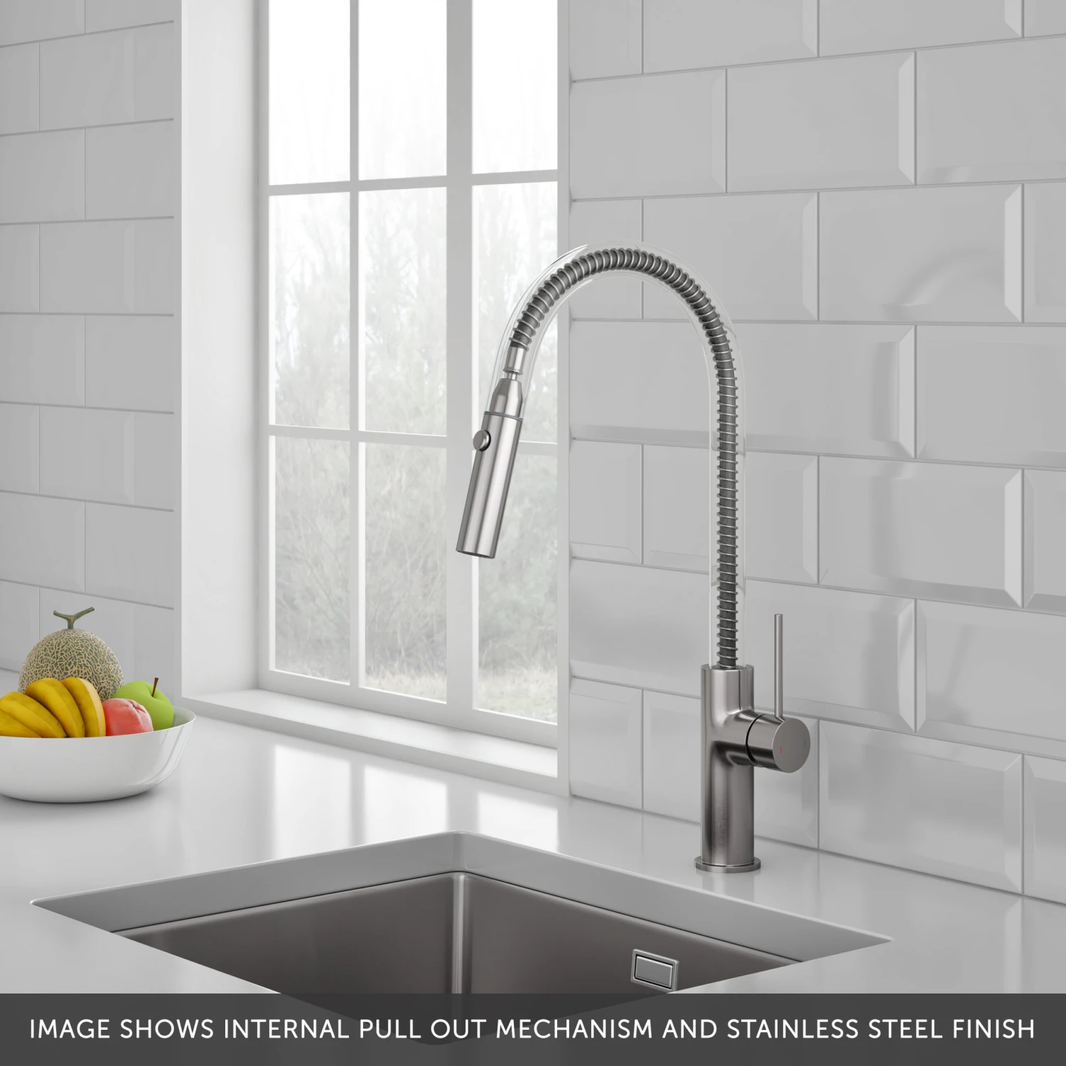 - Unique design houses the spring mechanism for the pull out spout inside the spout itself, removing the need for a counter-balance ball beneath the sink which can easily get tangled